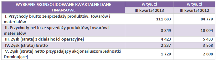 Na przestrzeni trzech kwartałów cała Grupa również osiągnęła wzrost r/r przychodów ze sprzedaży brutto – uzyskana kwota 287,8 mln zł jest o 4 % wyższa od wygenerowanej w okresie od stycznia do września zeszłego roku. Przychody ze sprzedaży netto wyniosły po trzech kwartałach 24,35 mln zł, zysk z działalności operacyjnej osiągnął wartość 10,2 mln zł, a zyski brutto i netto przypadający akcjonariuszom jednostki dominującej odpowiednio 4,4 i 4,17 mln zł .