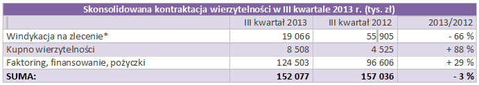 W III kwartale br. łączna wartość pozyskanych przez Grupę wierzytelności osiągnęła poziom 152 mln zł, z czego najwięcej, bo aż 124, 5 mln zł, wygenerowały usługi faktoringu, finansowania oraz pożyczek, wzrastając wobec III kwartału zeszłego roku o 29%. Największą dynamiką wzrostu może natomiast pochwalić się usługa kupna wierzytelności, która zamknęła się w kwocie 8,5 mln zł wobec 4,5 mln zł uzyskanych rok wcześniej, co oznacza wzrost aż o 88%.
