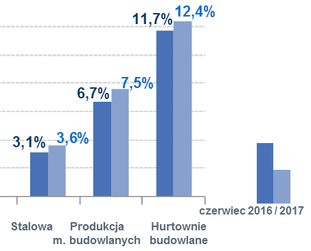 Tomasz Starus komentuje: „Za wzrostem liczby niewypłacalności firm budowlanych na początku roku stała ich wciąż pogarszająca się płynność finansowa po kryzysowym 2016 roku. Świadczą o tym wskaźniki spływu należności za materiały budowlane w I kwartale, gorsze o ok. 10% w stosunku do tych z IV kwartału 2016. Dobre nastroje na rynku, podsycane informacjami o uruchamianiu nowych przetargów publicznych zachęciła wielu dostawców materiałów budowlanych do ofensywy sprzedażowej na rynku – m.in. w marcu obroty dostawców materiałów budowlanych wzrosły o 32% r/r. Ponad dziesięciokrotnie więcej, niż wzrost w tym czasie wartości rynku prac budowlanych. Część dostawców zdała sobie sprawę z ryzyka, iż to oni mogą ponieść główny bieżący koszt (a tym samym i ryzyko) finansowania firm budowlanych. Stąd w czerwcu nie obserwowaliśmy już takiej zwyżki obrotów w stosunku do roku ubiegłego. Wzrost r/r w tym miesiącu wyniósł 2% zarówno po stronie producentów, jak i hurtowników budowlanych.”