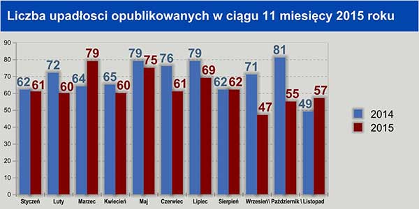 Od początku roku opublikowano informacje o 686 upadłościach, tj. o 9% mniej niż w analogicznym okresie 2014 r. Zwiększenie w ostatnim miesiącu liczby upadłości miało związek z liczniejszymi niż przed rokiem upadłościami hurtowni (aż 11 opublikowanych w listopadzie bankructw). Wciąż nie tylko największa obecnie, ale i wyższa niż przed rokiem liczba upadłości ma miejsce na Mazowszu i Śląsku.
