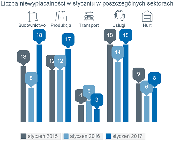 W styczniu opublikowano informacje o niewypłacalności 69 polskich przedsiębiorstw wobec 48 w styczniu 2016 roku, czyli nastąpił wzrost ich liczby o 44% (niewypłacalność – czyli niezdolności do regulowania zobowiązań wobec dostawców w różnych formach prawnych, upadłości czy postępowań restrukturyzacyjnych).